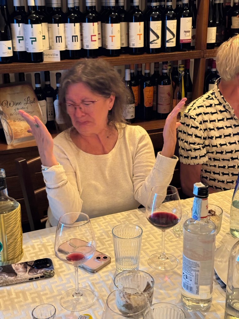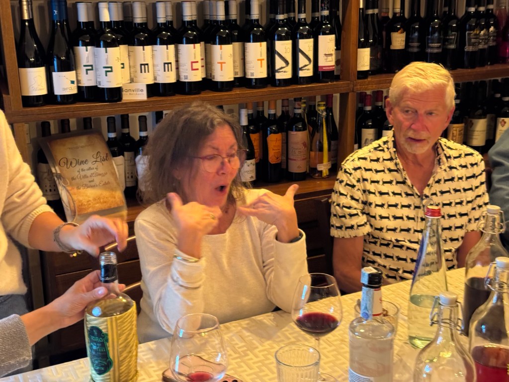 After a fabulous dinner we were treated to an impressive array of local liqueurs. We had fun tasting and comparing the various offerings. One digestif had 100 local herbs, but also had 70% alcohol. Lisa decided to give it a try, but wasn’t impressed.