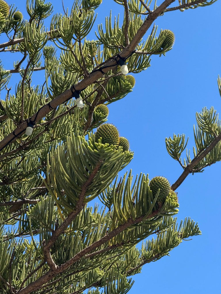There are many Norfolk Island Pines around the city, and this year we noticed that some of them are growing huge pinecones. We had never noticed that on previous visits.