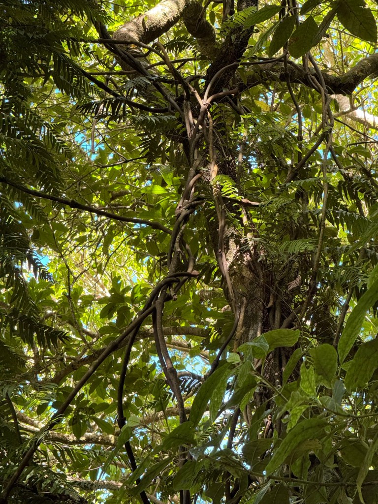 Everywhere you walk you see climbing vines, but these vines don’t harm the trees they climb on, unlike ivy. They don’t produce leaves, until they get to the top of the canopy, at which point they produce leaves and flowers. This next picture shows the vines twining together to climb higher.
