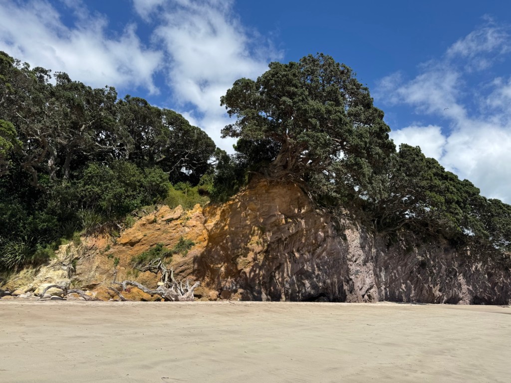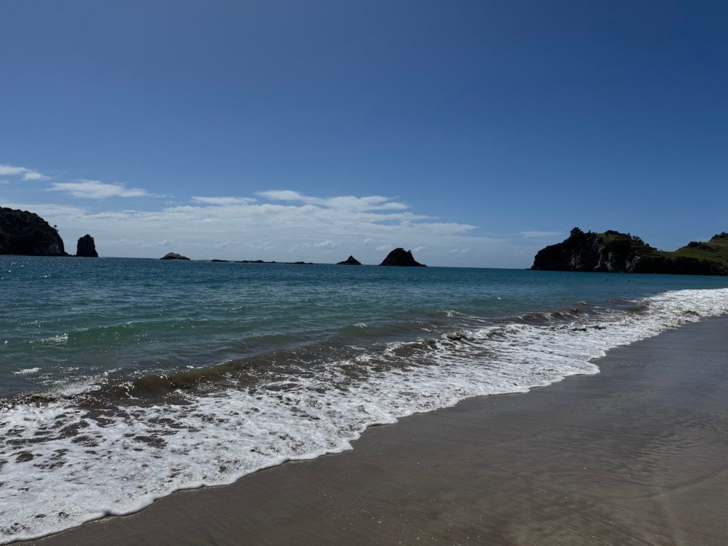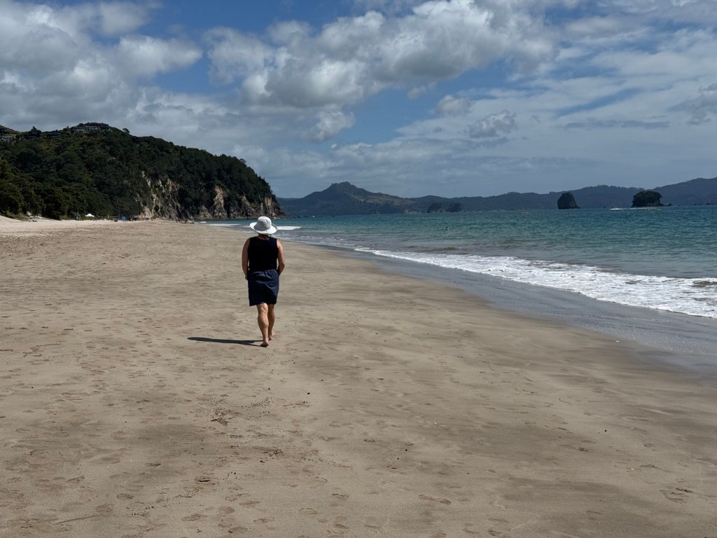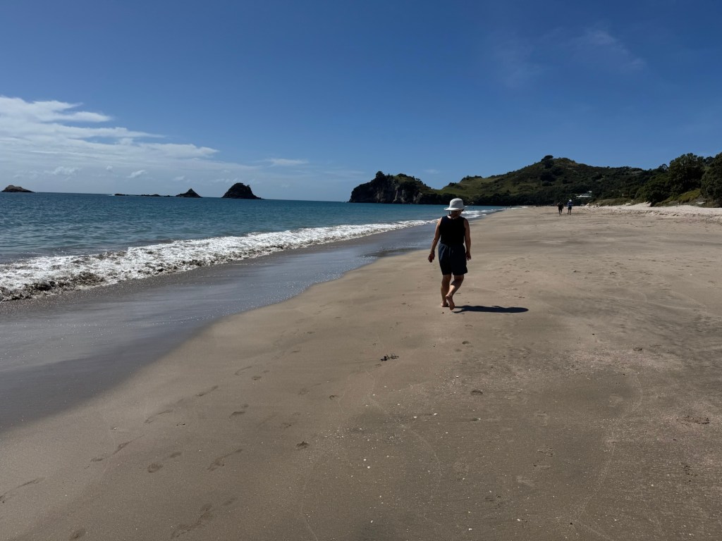Today we drove from Whitianga to Hamilton. It was a relatively modest drive, so we had time for a bit of a side quest. On our Cathedral Cove tour, we spotted something we thought was worth a closer look. Our objective was … wait for it … another fabulous beach, perfect for a barefoot walk.