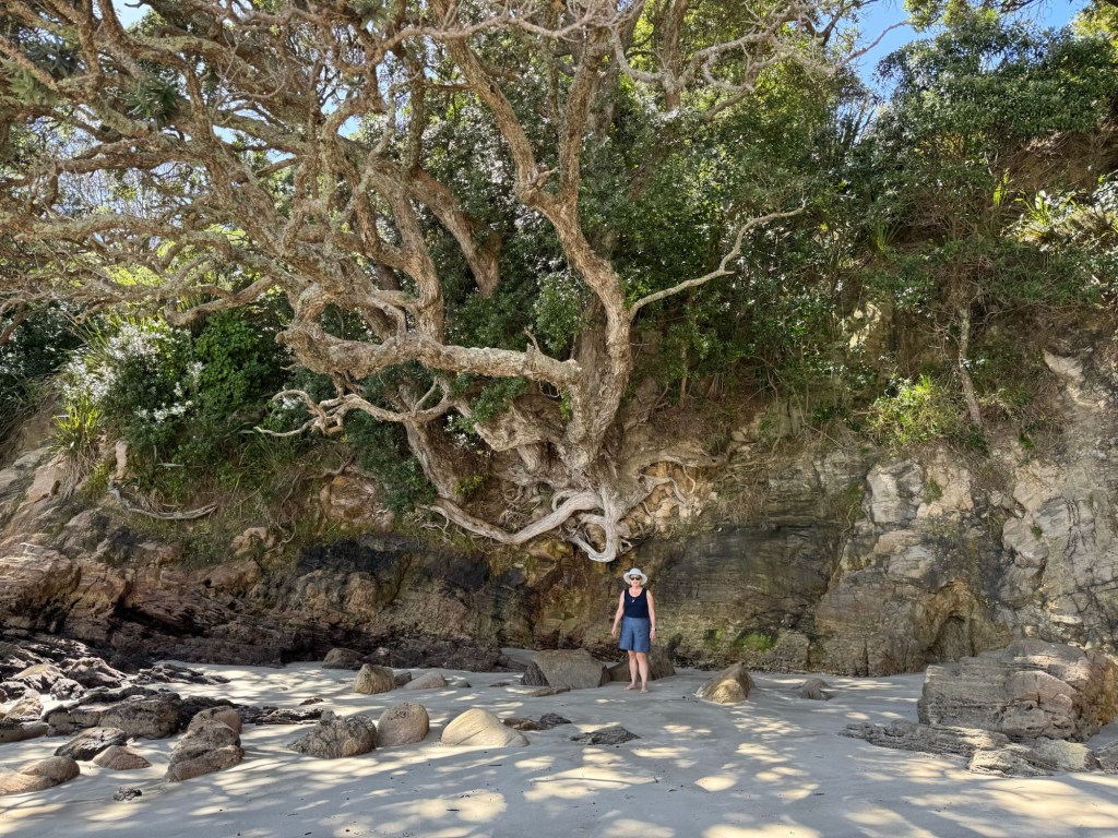 Sometimes we may give you the impression that New Zealand beaches go on forever. Today, we were able to reach the end of the beach. It was almost as impressive as the beach. Just look at that tree!