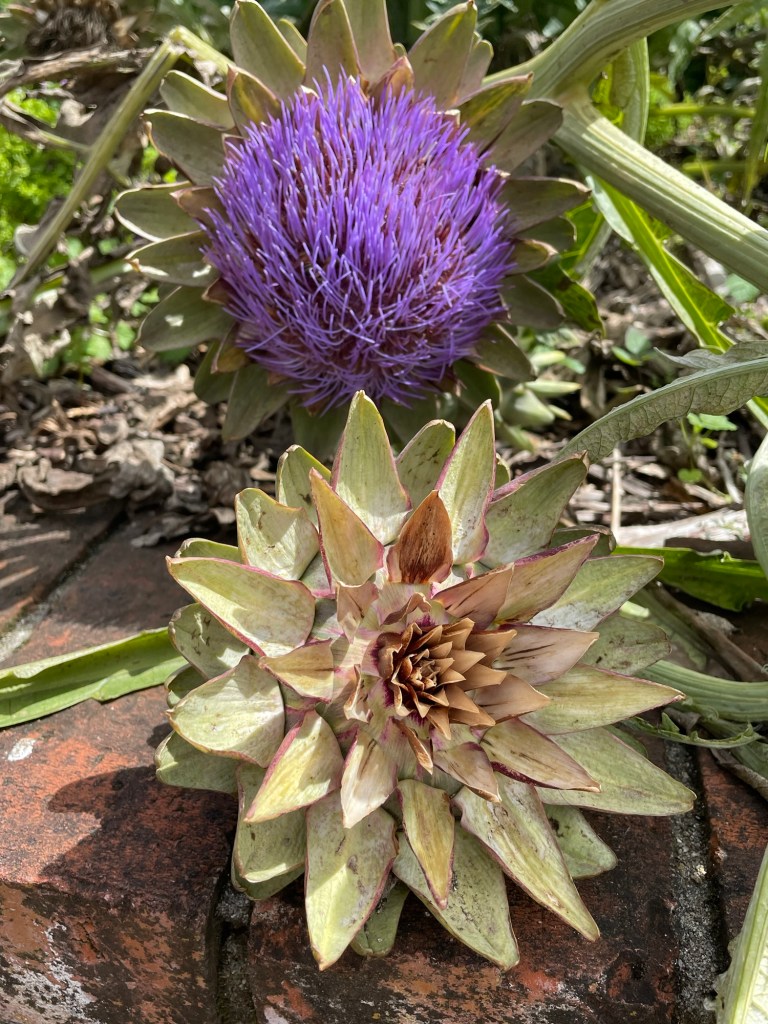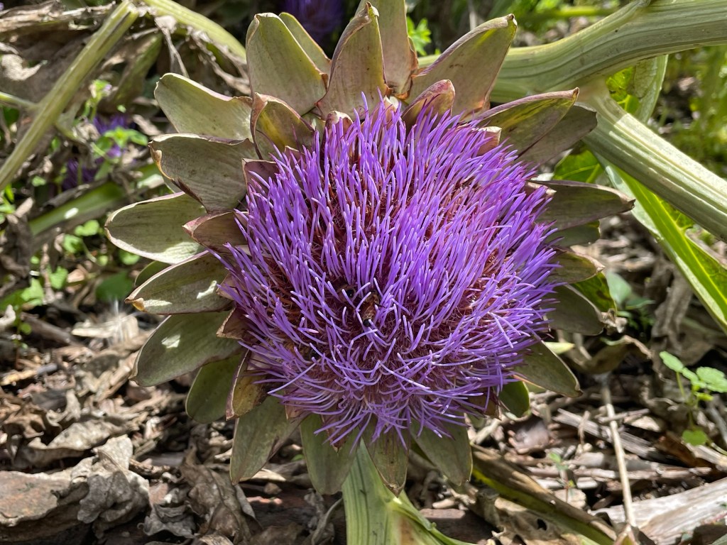 The next picture shows an artichoke flower. If you look closely you can see bees in the flower, having a great time.