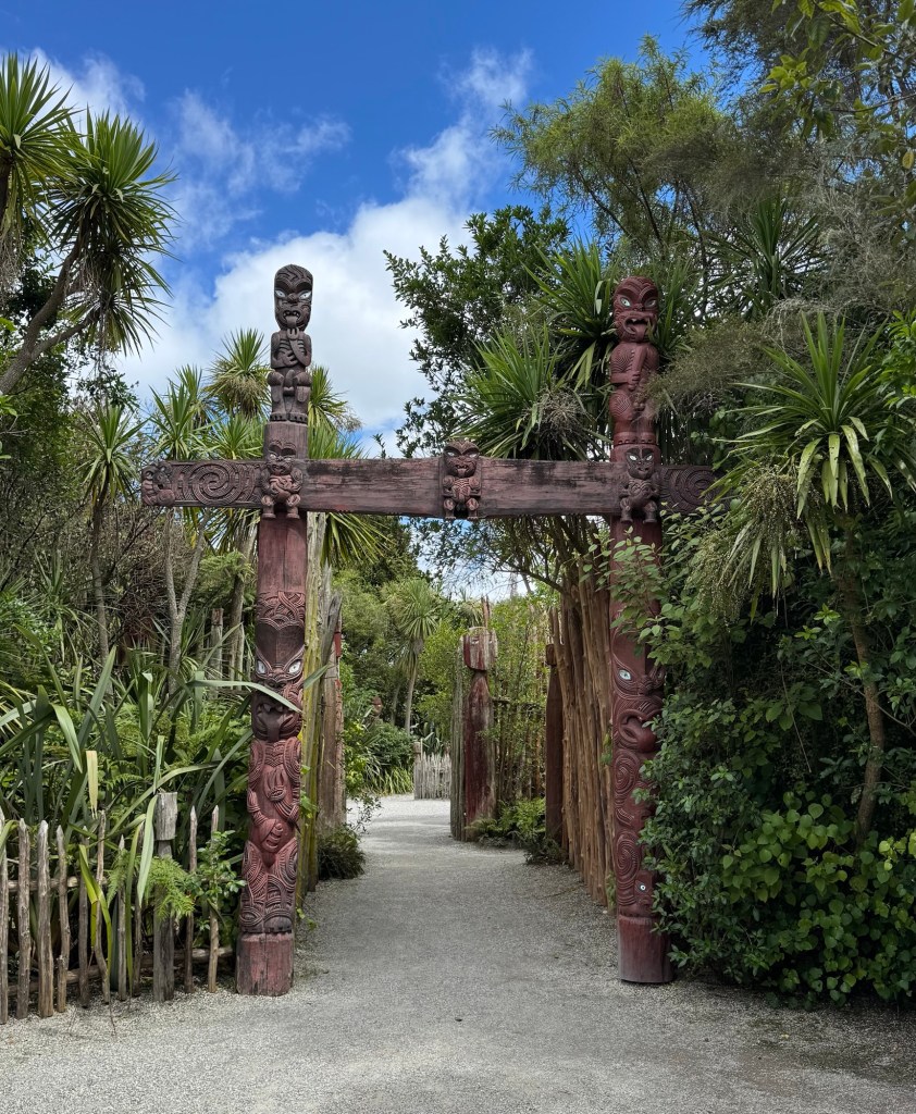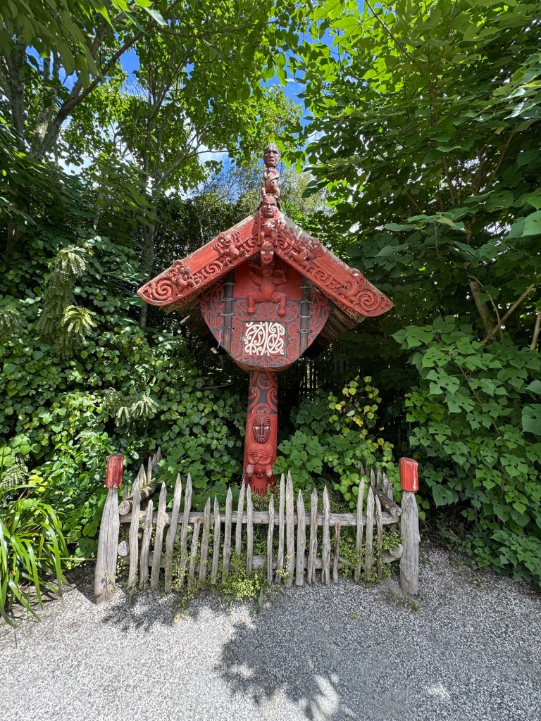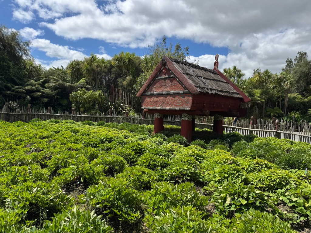Inside the garden, we learned that the kumara (sweet potato) is not native to New Zealand and requires special techniques to make it thrive in the colder climate. The Maori discovered that planting the kumara in small well drained hills, a little like potatoes, makes all the difference. The field is surrounded by a protective fence, and the raised hut is to store treasures.