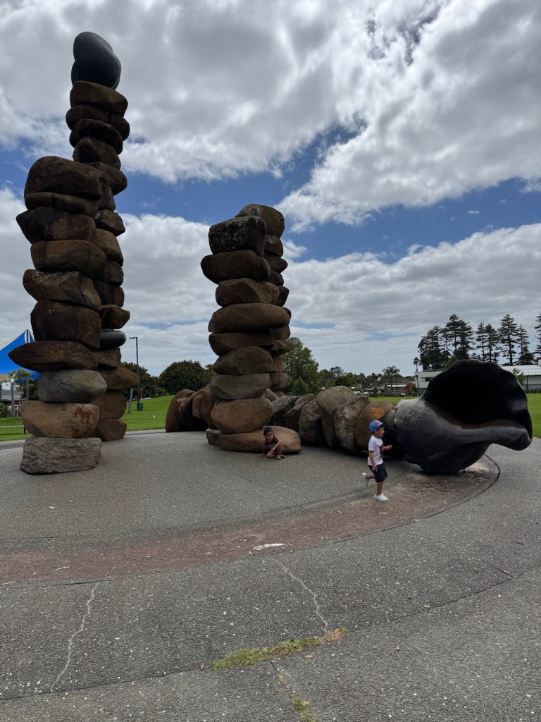 We spotted a nearby park with sculptures so we had to have a look. Two things about this jump out at me. One, it reminds me of collecting rocks and shells at the beach, something we love to do. And two, kids are free to climb over the sculpture, exploring to their heart’s content, just being kids.