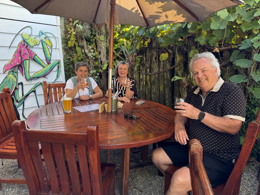 All this walking made us thirsty, and someone on the street recommended the perfect place for a drink. We took their advice, and found a lovely table in the shade. I tried a hazy ale, brewed specifically for this bar. The others tried the wine. Note the art on the wall behind Jan.