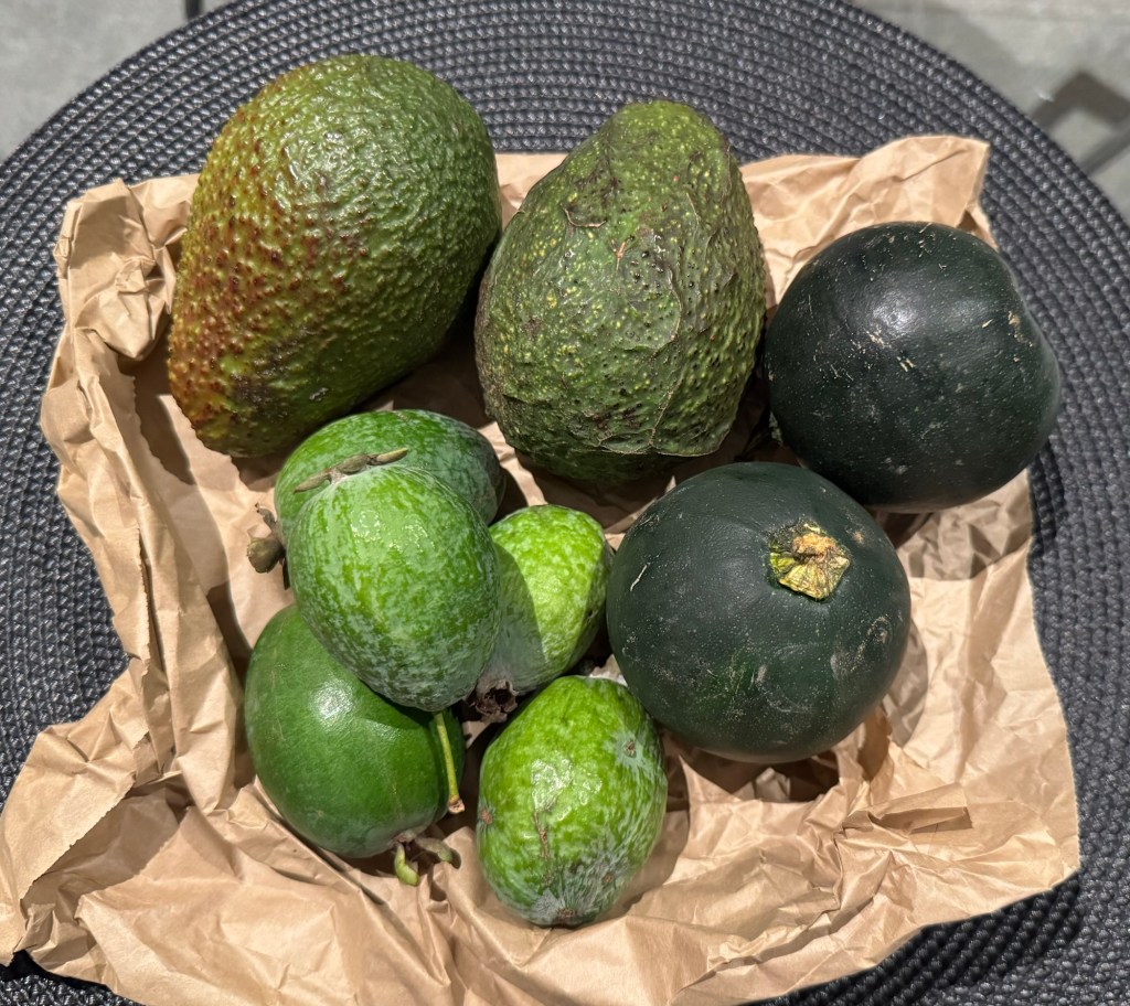 We had dinner booked with friends, but other than that, our day was open. We decided to check out the farmer’s market in Kerikeri. Most of the stands were closing up when we arrived, but we found one with ripe avocados for sale. We were quoted a price for two avocados, and then we started chatting with the vendor and asked about a fruit that looked a bit like a lime, but not quite. We learned that it was feijoa, the very first ones available this year. Before we knew it, we had our avocados, five feijoa, and two little gem squash. We asked how much for the extras, and he said they were free. People are so incredibly friendly here.