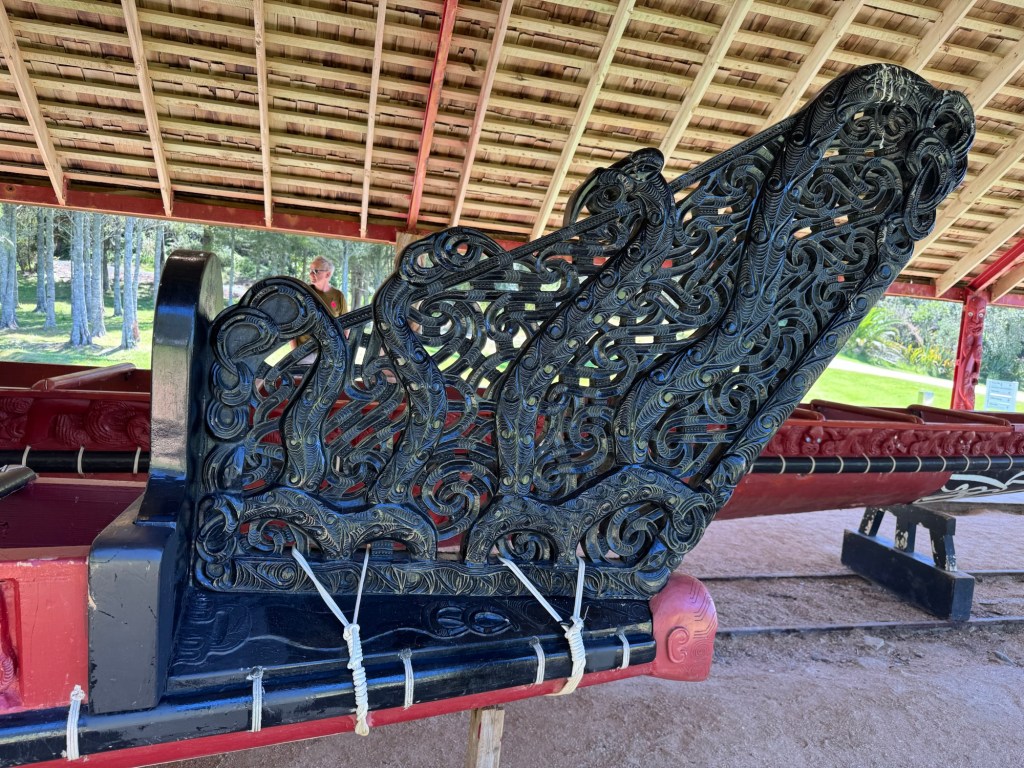 Today we visited the Waitangi Treaty Grounds – the site of the first treaty signed between the British Crown and the Maori tribes. We took a guided tour, which included a visit to a Maori war canoe carved to commemorate the Waitangi treaty, signed in 1840. The canoe is housed in a special building, decorated with symbolic carvings.