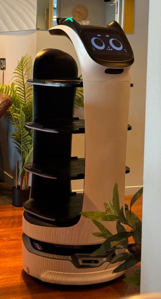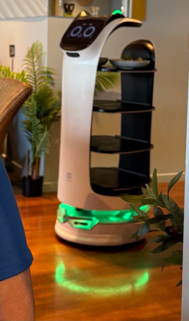 Fortunately a person came and placed the meal on the table, but the robot smiled and thanked you in a sweet voice before it turned and headed back to the kitchen.