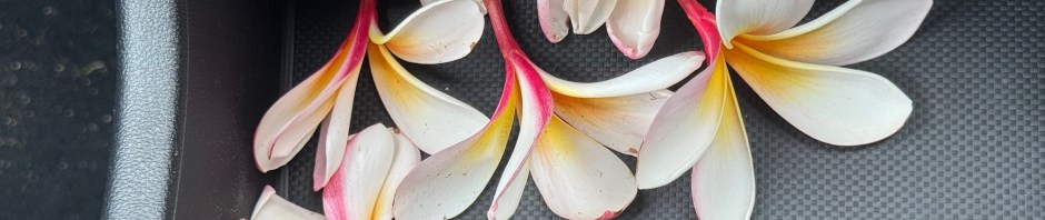 We loaded the car just in time for our 10:00 AM checkout, but we weren’t ready to leave Ahipara just yet. We found a public parking lot by the beach, and enjoyed one last walk along Ninety Mile Beach. At least for this trip. No pictures of the beach today – you already know how amazing it is. But as we were loading the car, the steps were littered with frangipani flowers knocked off by last night’s rain. We picked up a few to freshen the car, and to remind us of our amazing stay.