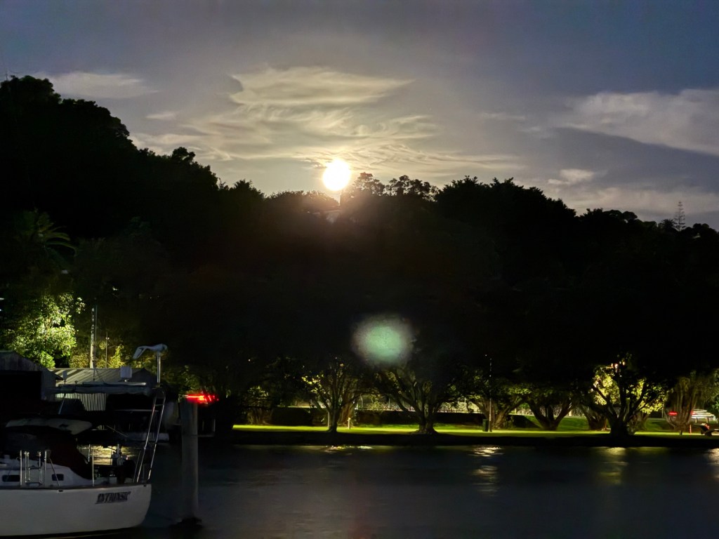 After dinner we needed to work off some of the calories, so we went for a stroll along the river as the moon was rising. The lunar eclipse was two nights ago (quite impressive, btw) so it’s still nearly a full moon. I took this picture as it was rising.