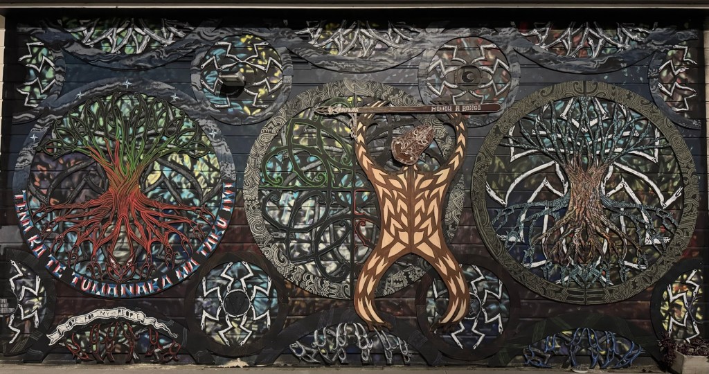 On our walk we came across this on the wall of one of the stores. It looks like a painting, but it is made of carved pieces of wood on the wall. Very stunning, especially at night with the shadows.